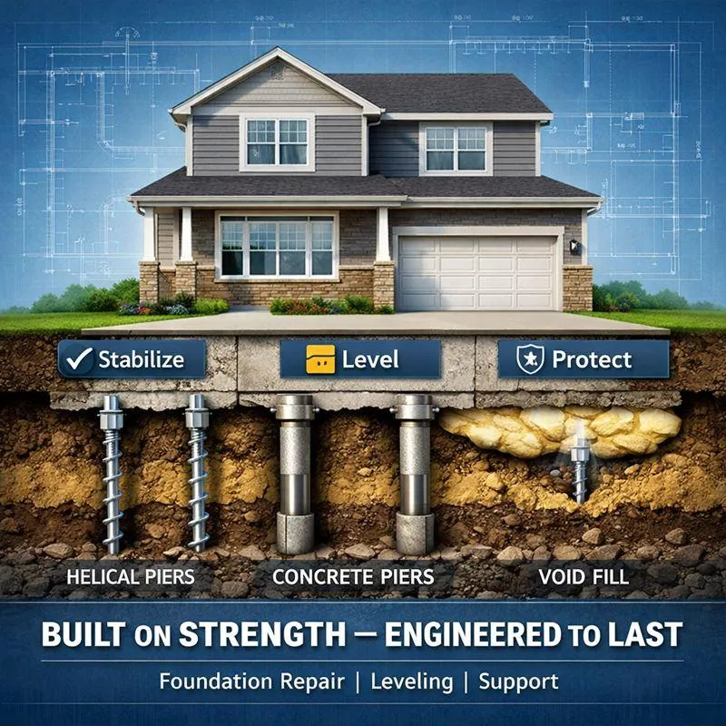 For homes built on slab-on-grade foundations, proper support is critical. We specialize in diagnosing slab movement and implementing targeted solutions to prevent further damage.